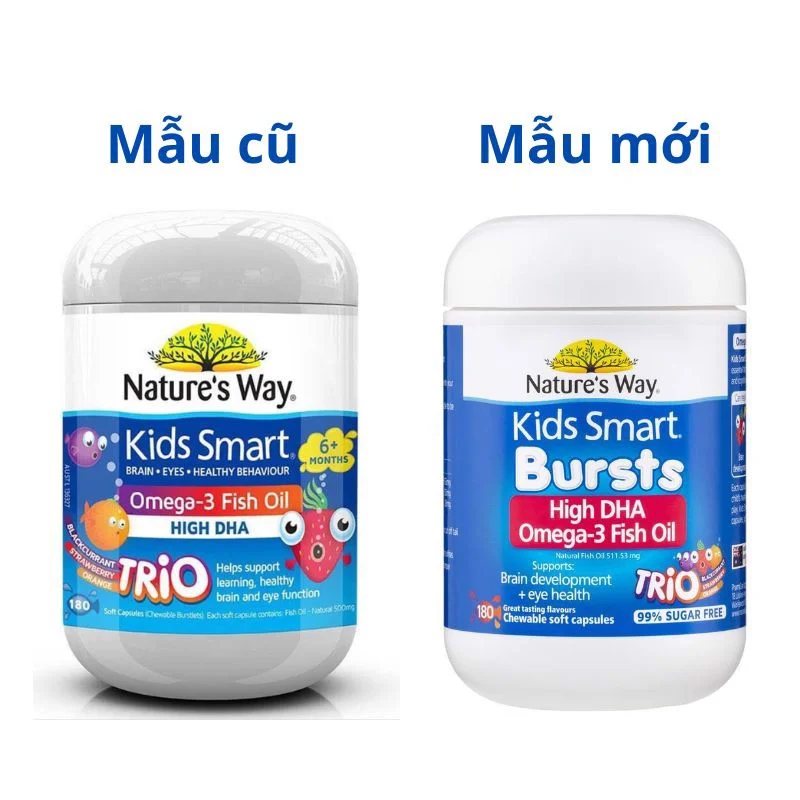- Mẫu mới nhất hiện nay ra mắt từ 2022, hãng Nature’s Way đã đổi tên thành Nature’s Way Kids Smart Bursts Omega-3 Fish Oil Trio 180s / Kids Smart High DHA Fish Oil Omega-3 Bursts