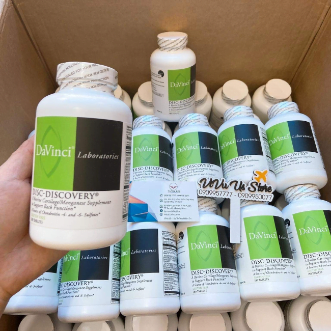 - Davinci Disc Discovery là viên uống chứa thành phần chính từ chiết xuất sụn khí quản của bò rừng độc quyền, đây là một nguồn cung cấp glucosamin và chondroitin tự nhiên tuyệt vời. Sản phẩm này hứa hẹn hỗ trợ hiệu quả trong việc điều trị các bệnh liên quan đến đau đốt sống cổ, thoát vị đĩa đệm và thóai hóa cột sống, đặc biệt đối với người trung niên và người cao tuổi.