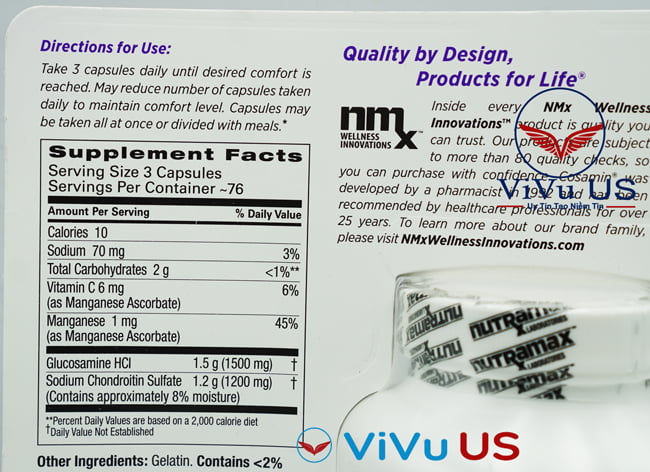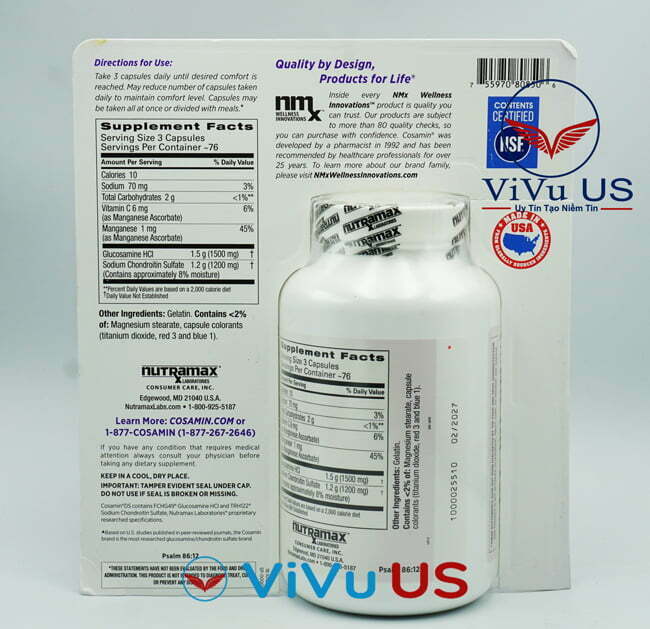 - Cosamin 230 viên được thử nghiệm cho tính tinh khiết, nồng độ của các hoạt chất, kim loại nặng và vi sinh vật bởi công ty Nutramax Laboratories Consumer Care.